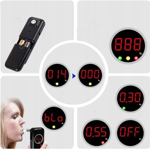 Automatyczne obliczanie funkcji alarmu trybu oszczędzania energii: Jeśli wynik pomiaru przekroczy 0,5 ‰ BAC, alkomat ostrzeże Cię alarmem dźwiękowym. Alkomat automatycznie wyłącza się 5 sekund po zakończeniu testu, aby oszczędzać energię. Posiada również wskaźnik poziomu naładowania baterii.