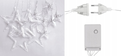 Zestaw lampek składa się z 4 wiszących gwiazd LED o wielkości 19 x 19 cm oraz 4 gwiazdek o wymiarze 9 x 9 cm. Długość girlandy wynosi 300 cm.