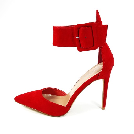 Z cholewką odsłaniającą kostkę i z paskiem wokół kostki oraz noskiem w kształcie szpica.