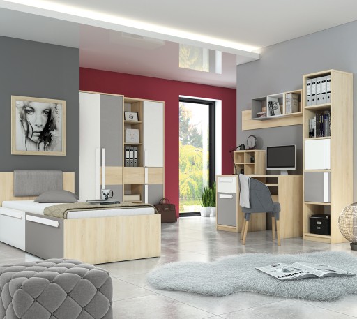 system składa się z : szaf, regałów, komód, kontenerka- szafki nocnej, łóżka, biurka, nadstawki nad biurko, skrzyni na kółkach, półek