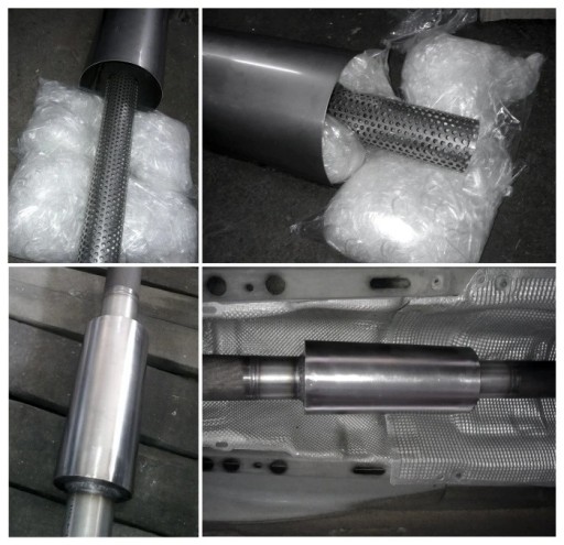 Montaż polega na umieszczeniu worków z watą bezpośrednio na rurze perforowanej owiniętej watą stalową wewnątrz komory tłumika.