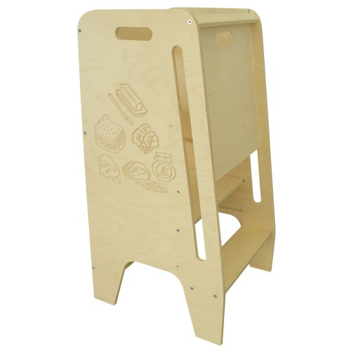 Produkt wykonany został ze sklejki naturalnej ( nie malowanej ). Mebel jest wytrzymały i stabilny. Może być wykorzystany dla dzieci o różnym wzroście dzięki trzy stopniowej regulacji wysokości. Wejście ułatwia stopień na wysokości 15 cm a bezpieczeństwo zapewnia wsuwana płyta. Nasz pomocnik jest ozdobiony z obu stron po jednej widnieje grawer z pieczywem a po drugiej grawer z gotową kanapką ( masło, sałata, dżem, ser i szynka ).