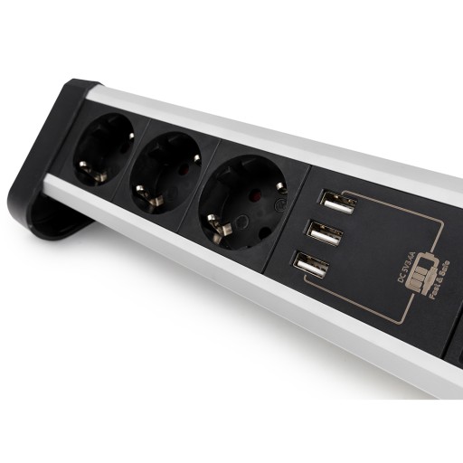 Listwa zasilająca Spacetronik ERGOLINE SPS-T38BS (srebrno-czarny)Gniazdo meblowe Spacetronik ERGOLINE SPS-T38BS to nowoczesne rozwiązanie, które znajduje zastosowanie w sklepach, salonach sprzedaży, salach konferencyjnych, biurach, a także w domu. Gniazdo blatowe zostało wykonane z aluminium i wysokiej jakości komponentów. Listwa elektryczna Spacetronik przeznaczona jest do montażu wewnątrz pomieszczeń w biurkach, blatach i stołach, zarówno w pozycji pionowej, jak i poziomej, zapewniając dostęp do gniazd. Listwa zasilająca do biurka została wyposażona w 3 gniazda 110-250 V (typ Schuko), 3 porty ładowania USB-A oraz przełącznik zasilania.