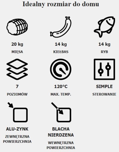 - pojemność 150 litrów umożliwia wędzenie do 20 kg mięsa lub wędzonej żywności.