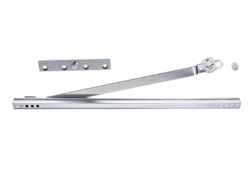- Wymiary: element montowany w skrzydle 340 mm. ramię 270 mm, zaczep montowany na ościeżnicy 100 x 17 mm