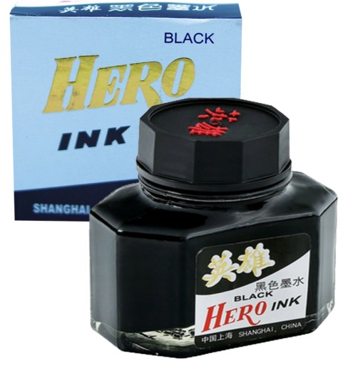 Tradycyjny atrament Hero do piór wiecznych. W buteleczce znajduje się 50 ml produktu w czarnym kolorze.