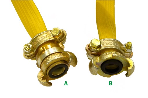 Każde z powyższych rozwiązań można stosować ze złączami kłowymi typu Atlas Copco (A). Złącza tego typu, różnią się od standardowych (D), materiałem wykonania, profilem choinki króćca do węży, charakterystycznym otworem (B) oraz profilem kołnierza zamykającego (C), który posiada tylko jedną charakterystyczną wypustkę ograniczającą.