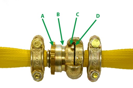 Złącze to montujemy z drugim złączem kłowym, w momencie, gdy pierścień jest odkręcony (A), a głowica z uszczelką (D) schowana. Skręcenie pierścienia (C) powoduje zamknięcie się złącza, oraz dociśnięcie do siebie uszczelek (D).