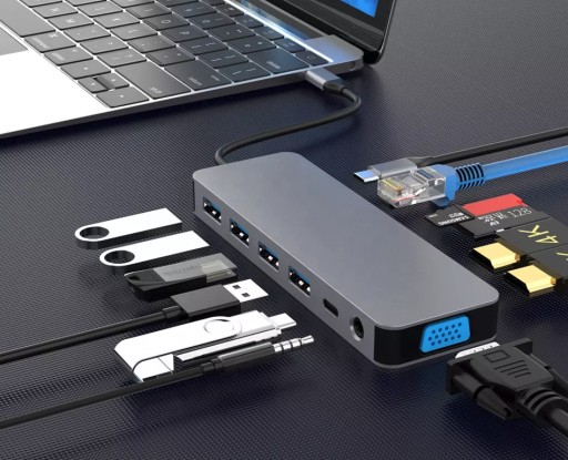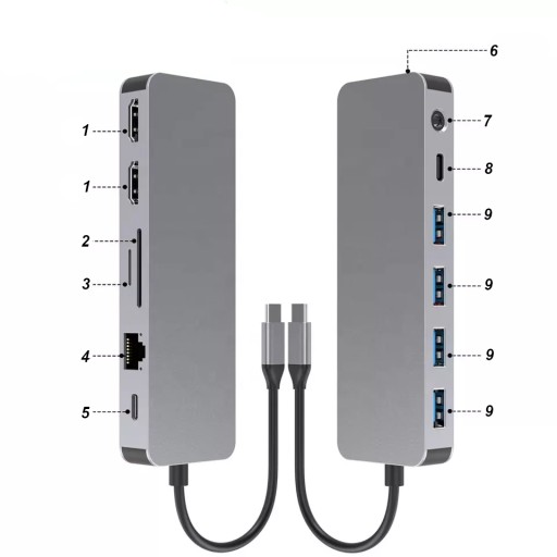 Wysokiej jakości designerski multi-port 13w1 adapter dla Twojego urządzenia. Wysokiej jakości - obudowa wykonana z aluminium w kolorze gray. Hub usb wyposażony w szereg niezbędnych portów 2x HDMI, 1x VGA, 4x USB 3.0, 1x Rj45 Ethernet, czytniki kart pamięci, 2x USB-C oraz 3,5mm AUX.