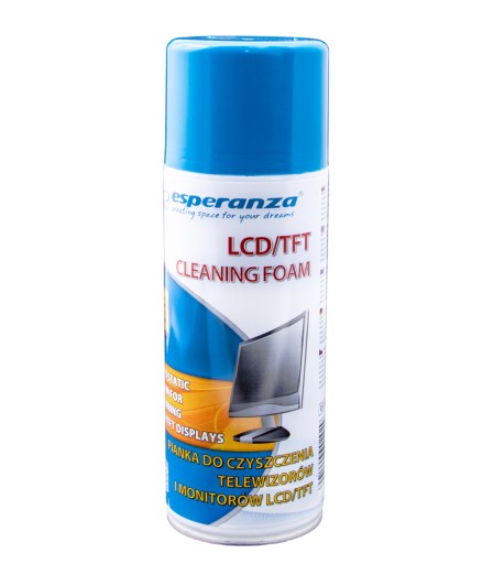 Antystatyczna, bakteriobójcza pianka do czyszczenia wyświetlaczy ciekłokrystalicznych LCD/TFT w laptopach, palm topach, telewizorach, monitorach i innych urządzeniach wyposażonych w wyświetlacz LCD. Nie pozostawia smug. Usuwa uporczywy kurz i brud. Mała ilość pianki należy nanieść na miękką ściereczkę lub chusteczkę bezpyłową Esperanza i wyczyścić monitor. Pianka do czyszczenia monitorów Esperanza zawsze pozostawi Twój monitor błyszczący i jasny, a wyświetlany na nim obraz zawsze będzie wyrazisty.