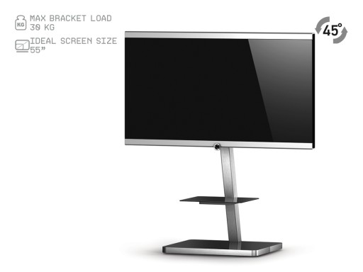 PL2710 Stylowy stojak z uchwytem na telewizor lcd z możliwością obrotu ekranu, konstrukcja wykonana z wysokiej jakości aluminium o kształcie kwadratowym, blat podstawy wykonany z hartowanego szkła z polerowanymi krawędziami, lakierowany w czterech kolorach: czarny, grafit, biały lub czerwony. Podstawa o szerokości 60 cm. Kolumna na której znajduje się uchwyt do tv wyposażona w system zarządzania kablami. Przeznaczony do telewizora od 37" do 55".