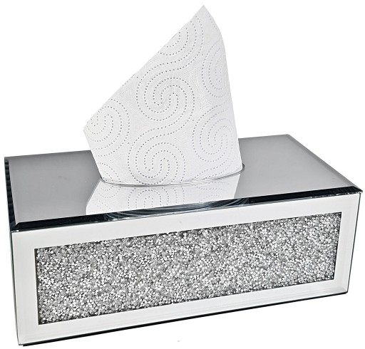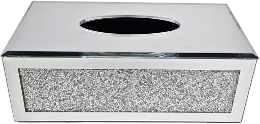 Pudełko na chusteczki z kryształami po bokach (z każdej strony) oraz lustrzaną górą. Dno pojemnika jest plastikowe, a środek welurowy. Otwór jest w kształcie owalu.