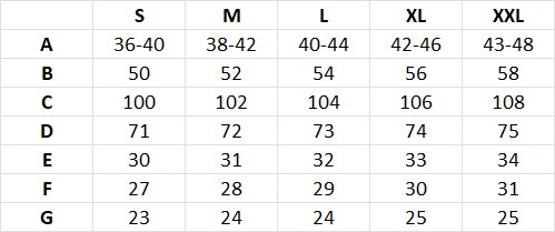 - A - szerokość w pasie (podana przed i po naciągnięciu gumy)