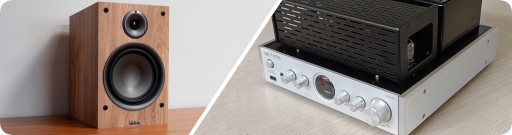 Kolumny podstawkowe z 8" głośnikiem basowym w kolorze dębu oraz hybrydowy wzmacniacz lampowy