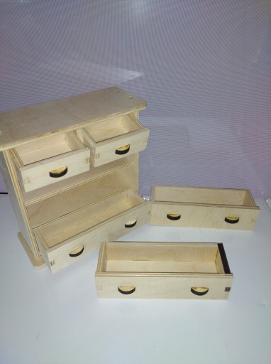 Komoda z szufladami dla lalki Barbie wykonana z eko sklejki 6mm posklejana na wpusty bardzo mocnym wodnym klejem co czyni ją bardzo trwałą. Wysokość 17cm szerokość 17cm głębokość 6cm Posiada 3 szerokie szuflady i dwie małe Może służyć jako sekretarzyk na biżuterię lub inne drobiazgi