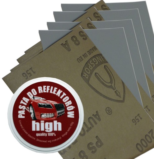 - 4 arkusze papierów ściernych 115x280mm do pracy na mokro P800, P1200, P1500, P2000. Służą do usunięcia zniszczonej warstwy reflektorów oraz przygotowania reflektorów do polerowania pastą polerską.