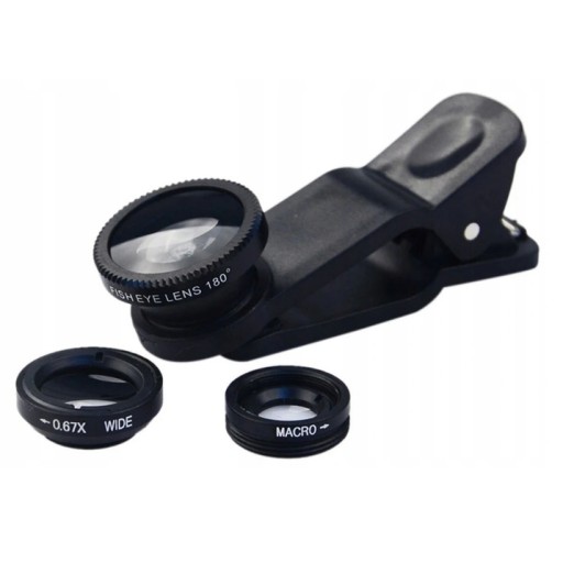 Wysokiej jakości zestaw 3 obiektywów do smartfonów i tabletów wyposażonych we wbudowany aparat fotograficzny! Każdy z obiektywów pozwala uzyskać inny efekt zniekształcenia obrazu, pozwalając w prosty sposób wykonać zjawiskowe zdjęcia! Wystarczy zamontować jeden z żądanych obiektywów na oku kamery w telefonie korzystając z dołączonego w zestawie klipsa! Następnie uruchamiamy aplikację aparatu w urządzeniu i gotowe!