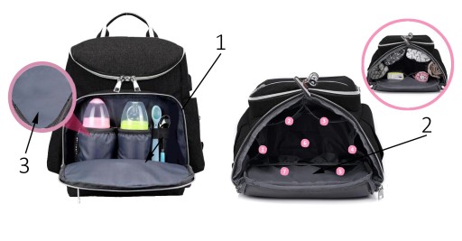 W poszczególnych komorach z przegródkami możesz poukładać rzeczy tak, aby wszystko było na wyciągnięcie ręki, np. ubranka, pieluchy, butelki, jedzenie, zabawki. Największa kieszeń torby zamykana jest na podwójny zamek błyskawiczny, co ułatwia wyciąganie z niej rzeczy. Wnętrze torby skonstruowane jest w sposób umożliwiający oddzielenie mokrych rzeczy od suchych, np mokrych szmatek od ubrań. Mokre przedmioty możesz umieścić w wodoodporny worek i włożyć do jednej z przegródek.