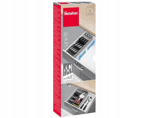 Dzięki możliwości regulacji, możesz dostosować go do swojej szuflady. Jest bardzo łatwy w utrzymaniu, wystarczy przetrzec go wilgotną ścierką. Zapewnij sobie porządek w szufladzie z organizerem firmy Metaltex.