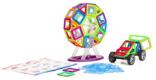 Zestaw zawiera 112 elementów klocków. Elementy są namagnesowane, z możliwością łączenia się.