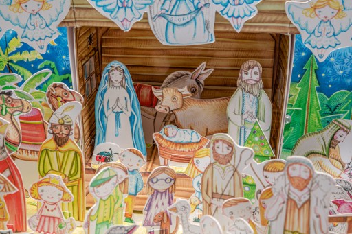 Maryja, Dzieciątko i Józef, anioły, trzech mędrców, gwiazda, palma i różne zwierzęta oraz solidne pudełko z kartonu, które posłuży jako stajenka. Ciekawy prezent na adwent i Boże Narodzenie.