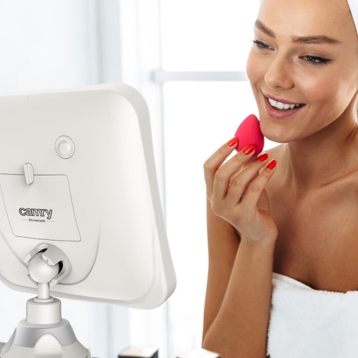 Łazienkowe lusterko kosmetyczne CR2169 marki CAMRY. Posiada 5-krotne powiększenie oraz podświetlenie diodami LED dzięki czemu może służyć zarówno do profesjonalnego makijażu, jak i pielęgnacji. Wyposażone jest ono w mocną przyssawkę, która utrzymuje lusterko w wybranym przez nas miejscu, a sam montaż jest szybki i łatwy, bez konieczności zastosowania śrub czy uruchomienia wiertarki. Wystarczy jedynie oczyścić z pyłu i tłuszczu powierzchnię, na której chcemy zainstalować lustro. Przyssawka działa na płytkach, szkle, ceramice, marmurze oraz większości innych płaskich powierzchni. Należy mocno docisnąć ją do powierzchni, delikatnie obrócić podstawę przystawki w kierunku zgodnym z ruchem wskazówek zegara, aż usłyszymy kliknięcie i obrócić lustro do wybranej pozycji. Dzięki systemowi blokującemu zassane powietrze utrzyma się ono na każdej powierzchni. To idealne rozwiązanie dla wszystkich, którzy nie mają miejsca na duże lustro w łazience.