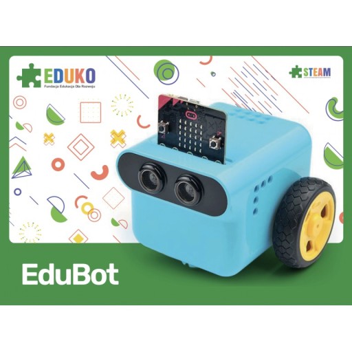 Inteligentny robot EduBot to zabawa i nauka w jednym. Działa w dwóch trybach: 1. bez programowania i wkładania płytki micro:bit oraz 2. z płytką micro:bit. Zasilany jest czterema bateriami AAA. Płytka micro:bit nie jest wymagana do prawidłowej pracy robota, jednak jej obecność daje możliwość rozszerzenia funkcjonalności EduBota. Jest kompatybilny z micro:bit w wersji V1 i V2. Programowalny za pomocą przyjaznego środowiska graficznego MakeCode. Umożliwia najmłodszym użytkownikom przystępną i efektywną naukę programowania oraz pomaga w rozwijaniu kreatywności. Możesz zmienić swojego EduBota w radiowóz, sprawić, aby był widoczny w ciemności, a nawet zagrać z nim w piłkę. Ogranicza Cię tylko wyobraźnia.