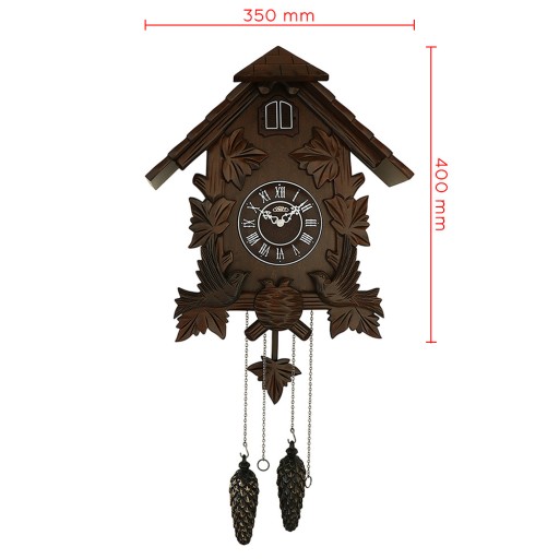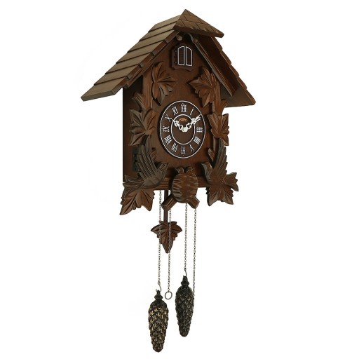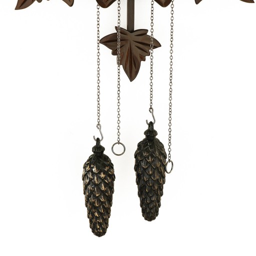Ręcznie rzeźbione drewniane kukułki. Za podstawę szafki posłużyło drewno lipowe precyzyjnie obrobione w motywy myśliwskie. Wahadło jest również drewniane, a obciążniki w kształcie szyszek sosnowych pełnią funkcję dekoracyjną, gdyż napęd zapewnia mechanizm kwarcowy na baterie. Zdobione białe wskazówki wystarczająco kontrastują z brązową tarczą z imitacją drewna. Co pełną godzinę mała kukułka poinformuje Cię swoją kukułką o czasie 1-12 razy, w zależności od liczby godzin. Kukułka jest również zasilana elektrycznie i oprócz kukułki w tle słychać odgłosy lasu. Głośność dźwięków można regulować elektronicznie, nie musisz też martwić się o hałas w nocy. Czujnik światła rozpoznaje natężenie światła i wyłącza funkcję podglądania w nocy, którą oczywiście można również wyłączyć ręcznie.
