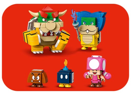 - Pięć zabawkowych figurek LEGO® Super Mario™ — Bowser, Ludwig, Toadette, Goomba i Bob-omb