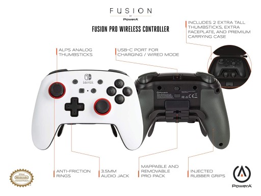Oficjalnie licencjonowany przez Nintendo, kontroler FUSION Pro Wireless jest wyposażony w funkcje, począwszy od trybu bezprzewodowego Bluetooth, mapowalnego pakietu Pro Pack z czterema programowalnymi łopatkami, które możesz przypisać w locie, w trakcie akcji i kontroli czujnika ruchu. Możesz dostosować swój kontroler, aby grać godzinami w komfortowych warunkach. Zamień gałki analogowe, aby uzyskać mniejsze kąty i wybierz wklęsłą lub wypukłą nasadkę; - szybko załóż jeden z dwóch paneli przednich, w tym miękki w dotyku czarny panel przedni, lub wybierz piękny klasyczny biały wygląd. Uwaga: gniazdo audio stereo 3,5mm dostępne tylko w trybie kontrolera przewodowego.