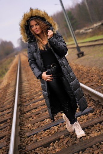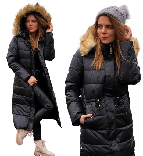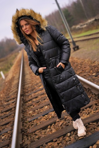 DŁUGI PŁASZCZ ZIMOWY PIKOWANY CZARNY Z KAPUTREM I ODPINANYM FUTREM NA KAPTURZE;