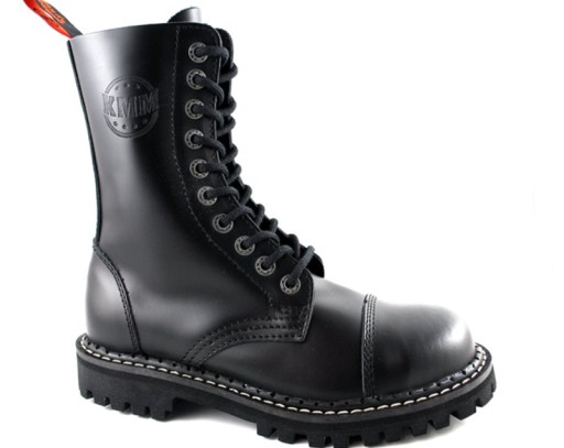 Klasyczne, 10 dziurowe glany firmy KMM wykonane z naturalnej skóry licowej. Podeszwa klejona jest trójwarstwowo dla lepszej elastyczności i odporności, antypoślizgowa rzeźba bieżnika. Czubki butów wzmacniane są stalowymi noskami.