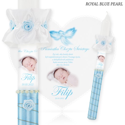 Piękny zestaw drewniane pudełko na świecę wraz z ręcznie zdobioną świecą oraz szatkę wraz z srebrnym obrazkiem Anioła Stróża i grawerem z okazji Chrztu Świętego.