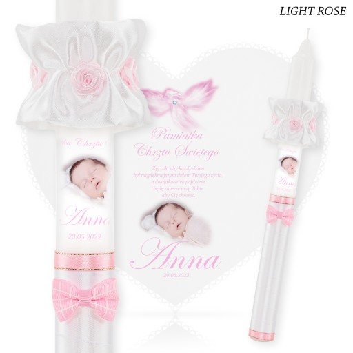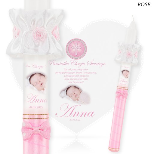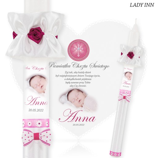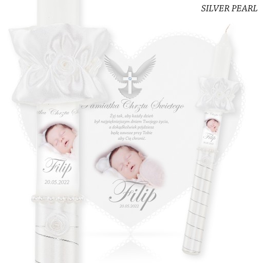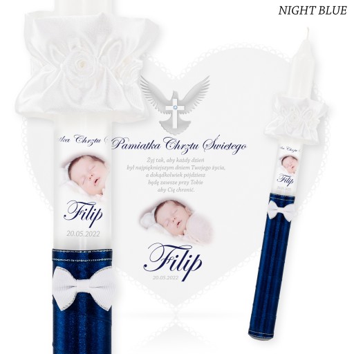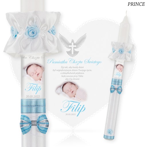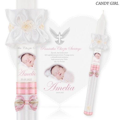 Prezent w postaci białej szatki na chrzest i świecy to pierwsze podarki dla dziecka od rodziców chrzestnych. Piękny motyw delikatnego koronkowego wzoru wokół szatki idealnie współgra z imieniem dziecka i dedykacją.