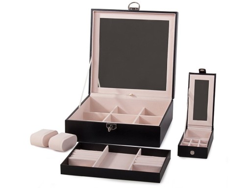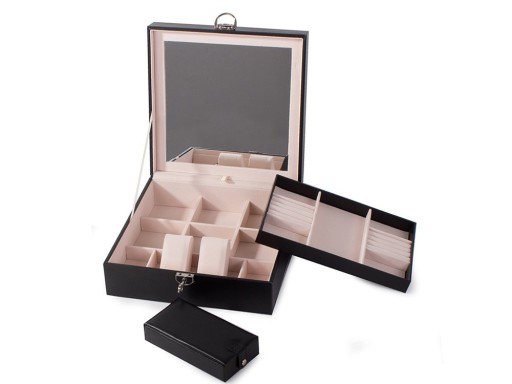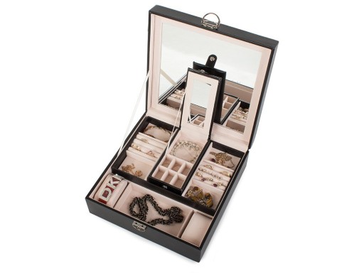 Szkatułka na biżuterię składa się ze zdejmowanej części oraz znajdującej się pod nią części podzielonej na sześć oddzielonych od siebie przegródek. Na dnie znajduje się jeszcze większa komora oraz dwie idealne na zegarki lub bransoletki. Na nakładce możemy umieścić pierścionki na dwóch wałeczkach po prawej i lewej stronie. Jest tu też dużo miejsca - na przykład na wisiorki - kolejne cztery przegródki.