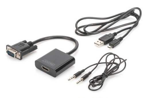 - Akcesoria w zestawie: Konwerter VGA HDMI Kabel audio (3,5 mm) 1 m Przewód micro USB 1 m