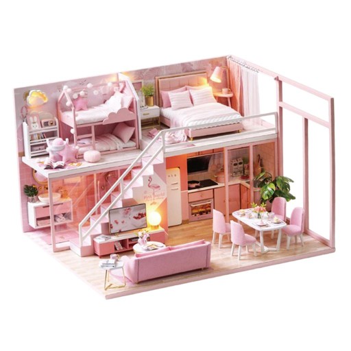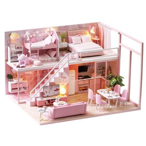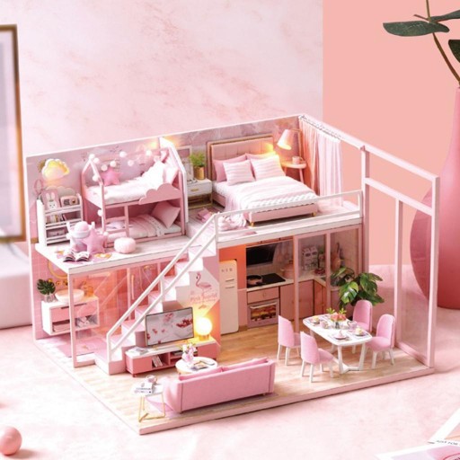 1/24 DIY miniaturowy dla lalek drewniany dupleks dom różowy z