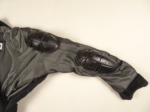 Kurtka motocyklowa, wzmocnienia przy barkach i na łokciach, ochraniacz pleców wyciągany.