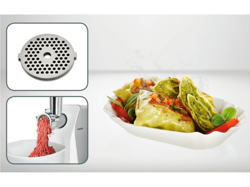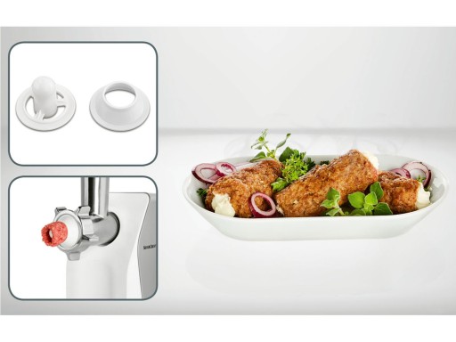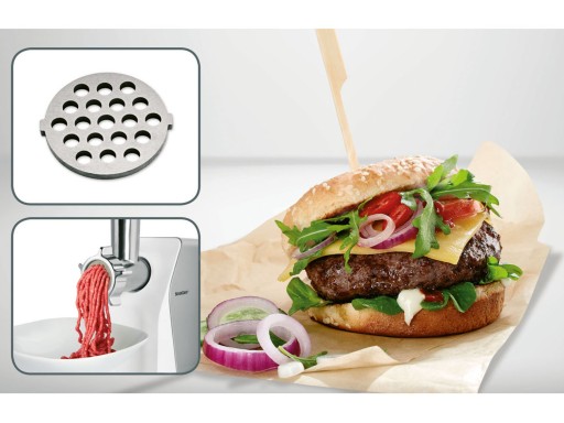 W zestawie: tacka do napełniania z popychaczem, 3 sitka z otworami (dużymi 7 mm, średnimi 5 mm, małymi 3 mm), nasadka do napychania kiełbasy, nasadka do kebbe, nasadka do ciastek