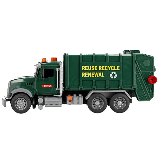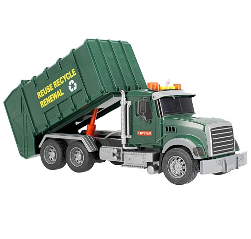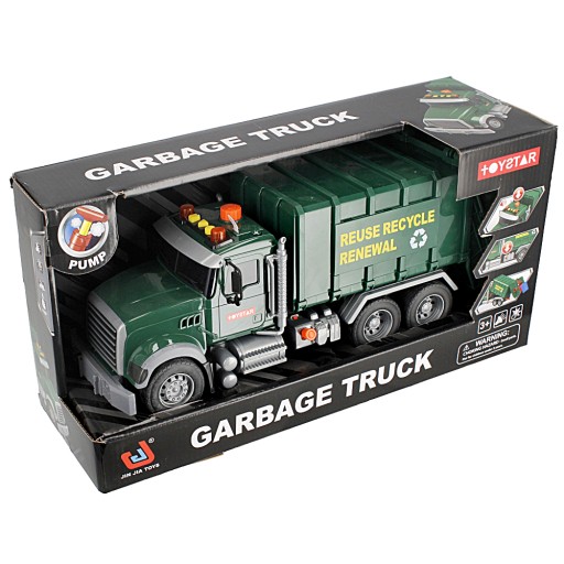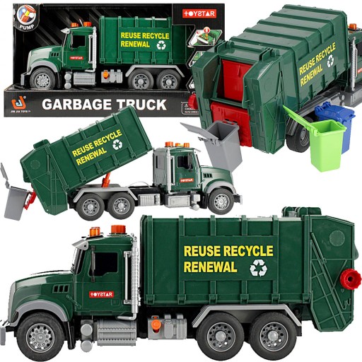 Śmieciarka posiada ruchome elementy, efekty świetlne oraz dzwiękowe-odgłos odpalanego silnika, klakson.