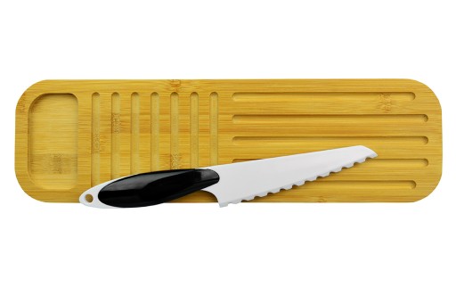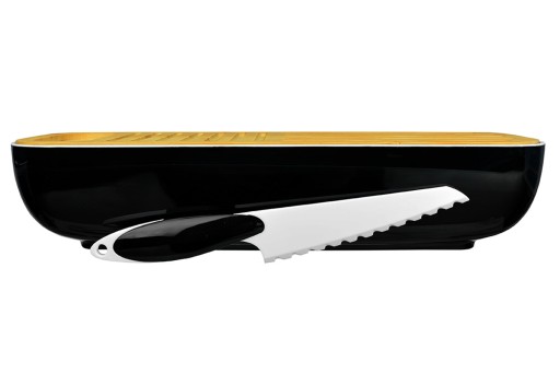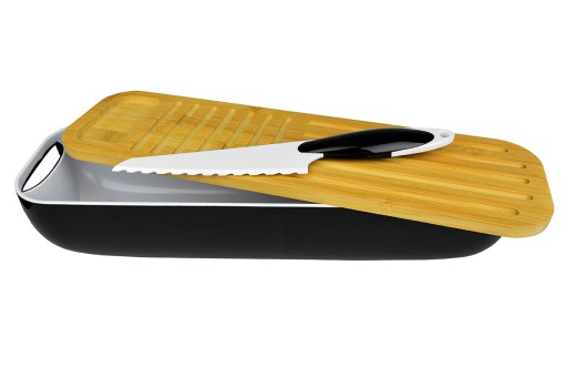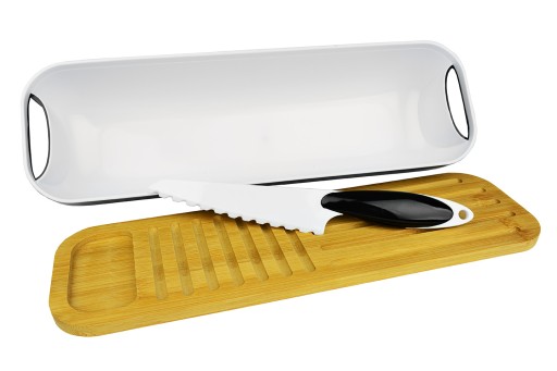 Elegancki pojemnik na pieczywo w zestawie z deską bambusową oraz nożem. Idealny do przechowywania bagietki. Z powodzeniem zmieści także bułeczki, ciastka lub podłużny chleb.