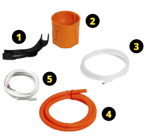- Łuk prowadzący, który gwarantuje zachowanie właściwej krzywizny przejścia rurki ze ściany do struktury podłogi,