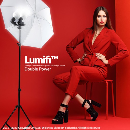 Lumifi™ to nowa generacja studyjnych lamp światła ciągłego oparta o ledowe źródło światła Ignitix™ i parasolki dyfuzyjne Softligt™. Lampy serii Lumifi dają jasne, naturalne światło o temperaturze 5500K, dzięki czemu nie dochodzi do przekłamań kolorystycznych w trakcie fotografowania i filmowania. Parasolka dyfuzyjna zmiękcza kontrasty i wygładza cienie. Idealnie nadaje się do fotografii portretowej, modowej i produktowej. Wszystko to w doskonałej wydajności energetycznej.
