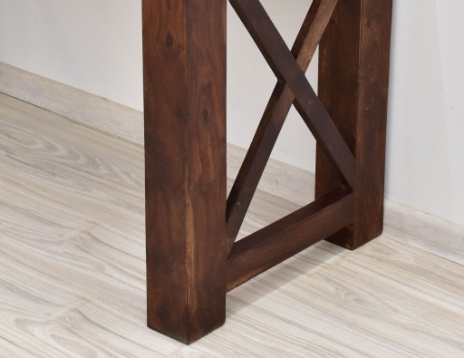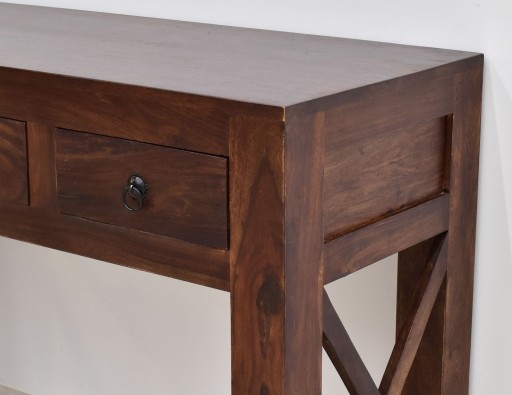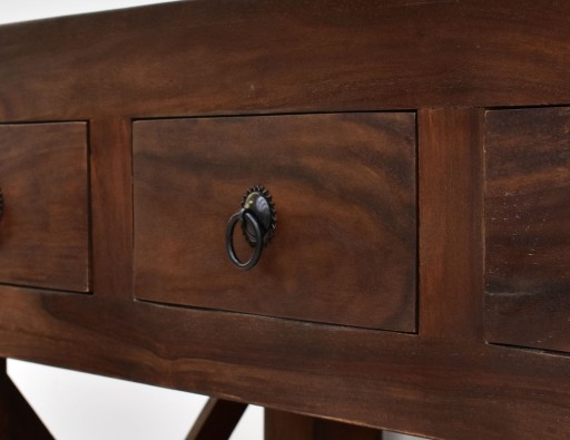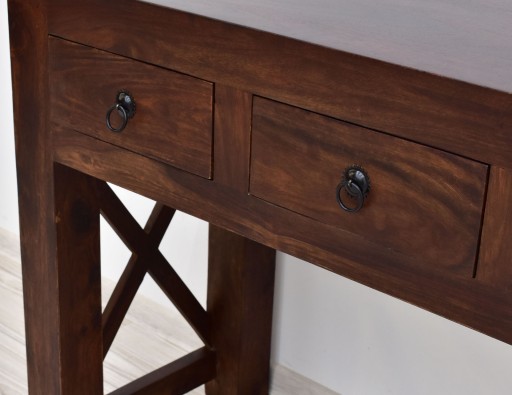Konsola kolonialna w bardzo wyszukanej formie. Posiada trzy podręczne szufladki wyposażone w delikatne uchwyty. Boki mebla zdobione w ciekawy ażurowy, drewniany motyw. Stworzona nie tylko z myślą o przedpokoju lub sypialnianych aranżacjach. Z powodzeniem może odegrać rolę biurka czy sekretarzyka. Wykonana w 100% z litego drewna palisandru indyjskiego w kolorze ciemnego ciepłego brązu. Każdemu wnętrzu nada orientalnego charakteru ze względu na charakterystyczne metalowe uchwyty oraz niesamowity, subtelny zapach drzewa różanego.