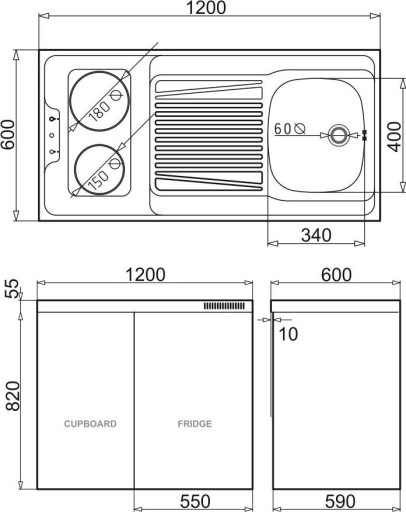 MK 120x60 (szafka + zlewozmywak + płyta grzejna + chłodziarka)