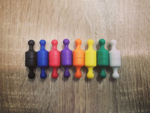 Pionki magnetyczne zrobione są z wysokiej jakości plastiku oraz magnesu neodymowego, który może z łatwością przytrzymać do 18 kartek papieru A4 na powierzchni metalowej.