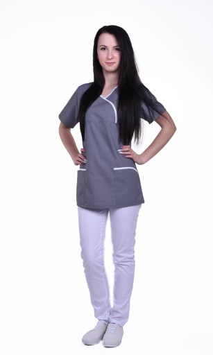 Bluza i spodnie wykonane z najwyższej jakości oddychającej elanobawełny. Bluza wykończona pod szyją naszywany na siebie V-neck, rękaw krótki. Dwie dolne, pojemne kieszenie. Spodnie klasyczne, na pasku z guzikiem typu NAP i rozporkiem.
