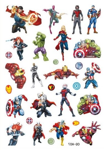 Tatuaże zmywalne w stylu filmów Marvel - Kapitan Ameryka, Avengers, Hulk, Doktor Strange. Zestaw składa się ze wzorów widocznych na zdjęciu, wielkość całego arkusza z tatuażami to 12 x 17cm.