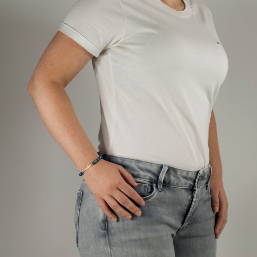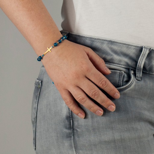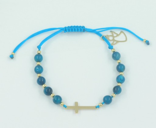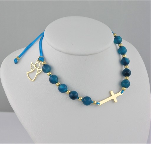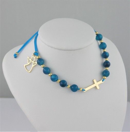 Na jubilerskim sznureczku o grubości 0,8 mm w turkusowym kolorze nawleczone są kamienie z naturalnego agatu i 12 szt srebrnych kulek, srebrny krzyżyk i srebrna zawieszka aniołek.
