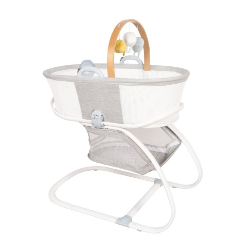 Łóżeczko PURAIR zapewni spokojny i bezpieczny sen Twojemu dziecku. Posiada zalety kosza mojżesza - stelaż, dzięki któremu można kołysać malucha. Samą gondolę można również wyjąć ze stelaża i przenieść w dowolne miejsce, a następnie położyć w niej dziecko do snu. Łóżeczko posiada boczne ścianki wykonane z siatki przepuszczającej powietrze oraz wygodny, twardy, płaski materac. Doskonale sprawdzi się dla dzieci od urodzenia do szóstego miesiąca życia. Siateczkowa tkanina zapewnia pełną widoczność rodzicowi. Łóżeczko wyposażone jest w kosz na akcesoria, pałąk z zabawkami oraz centrum uspokajające z lampką nocną, kojącymi wibracjami, kołysankami i dźwiękami natury.
